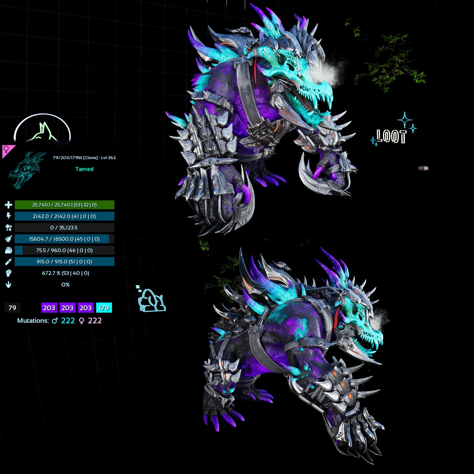 โค๏ธ Monstrous Affection (permanent stacks): while mounted, every 90 seconds you gain a stack (up to 20), giving roughly +10% total stats when capped; stacks persist through server restarts and cryopods.